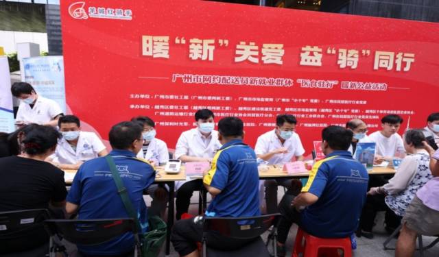 本次活动分为两个环节,第一个环节为“暖‘新’关爱·益‘骑’同行”——网约配送员群体“医食驻行”暖新公益活动,广州市民营医疗行业党委、越秀区总工会、越秀区建设街道、越秀区“小个专”党委、广州市医疗行业协会民营医疗分会、广州道路运输行业协会和爱心企业代表等分别为到场的骑手们提供了专业的外科、内科等义诊服务;同时开展了关于电动自行车安全、反诈禁毒、法律咨询等政策宣传,并为他们发放爱心早餐和爱心礼包。