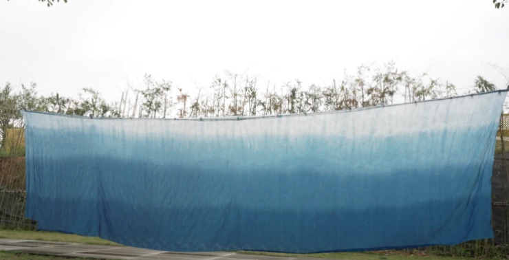 经过半小时的静置,样布呈现出理想的靛蓝色泽。赵亚坤展开布料,确认无误后,将用于展览的织物浸入染缸。