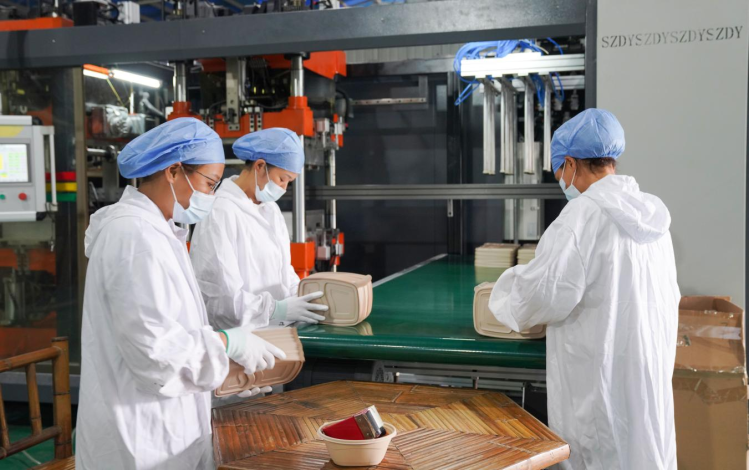 “这个竹粉盒子,别看它普普通通,可是大有乾坤,科技感满满。” 广东竹笙笙科技有限公司负责人袁秀平说道,通过回收废弃麻竹笋筒、笋壳和竹子,研发全降解竹生物基材料制成的一次性餐盒、刀叉勺、农膜,杯子等。这些竹制餐具使用创新型专利配方全降解复合材料,以可再生竹纤维原材料为主,全生物降解材质在土壤和自然环境下,128天可以自然降解93.8%,大大减少对环境造成的污染,获得了欧洲CE认证、FDA认证、德国TUV莱茵与SGS检测、国家标准认证,成功打入了欧盟,美国,印尼等国际市场。“以竹代塑”不仅直接提高当地笋农收入,进一步增加绿色产业产值,而且有效破解塑料污染难题,使群众美丽的家园更加健康、可持续,充满绿意生机。